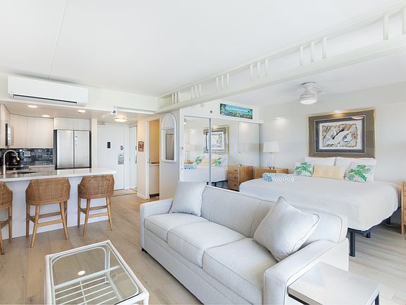 Welcome to your beautifully renovated island escape at the iconic Ilikai Hotel, where sweeping views of the lagoon and Pacific Ocean greet you from your private lanai. Enjoy front-row seats to the Friday night fireworks show and take in the sights from high-top outdoor seating perfect for morning coffee or sunset cocktails. Inside, no detail has been overlooked. This stylish unit features all-new flooring, a fully remodeled kitchen with stainless steel appliances and bar seating for three, and a modern, spa-inspired bathroom. A plush king bed promises restful nights, while a luxurious sofa invites you to unwind in comfort. The Samsung Smart TV keeps you connected with all your favorite streaming platforms. Experience elevated island living in one of Waikiki's most iconic destinations just steps from the beach, restaurants, and the best of Honolulu!