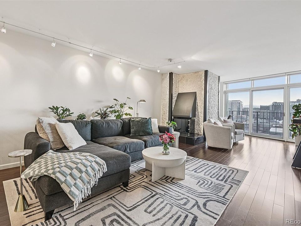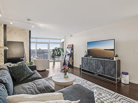 Floor-to-ceiling Pella windows and a sliding glass door fill the space with natural light and frame stunning views of the mountains and Union Station, while also enhancing energy efficiency and sound insulation. A newer installed heat pump and full-size in-unit washer and dryer add to the comfort and convenience. The marble bathroom features a walk-in shower, and custom closets throughout the home maximize every inch of storage.