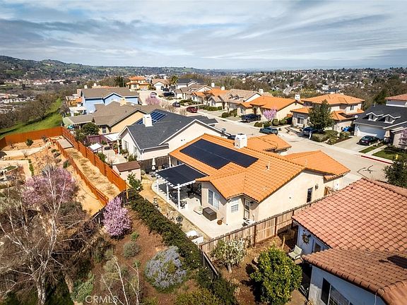 This home stands out from the rest with its Santa Barbara Style stucco exterior and numerous improvements! A custom wrought iron gate welcomes you into the front courtyard. Inside, there is a great floor plan offering three bedrooms and two fully remodeled baths. Matching leather-finish and smooth-finish granite countertops throughout. The open interior includes a living room and family room separated by a fireplace, and includes a large custom hutch. The dining room is next to the kitchen with a long breakfast bar. This home features high ceilings and plenty of large windows for natural light, with custom shutters. Every detail has been thought through on this home, so you can truly move in asap! New, fully-owned solar with extra panels were installed in 2023. Outside, you benefit from having a wider driveway, a concrete walkway along the side yard, and a large back patio with vinyl pergola to enjoy the beautiful sunset views in the evening! Producing fruit trees include peach, plum, lemon, lemon-guava, and apricot, plus a grapevine with a “Magenta” organic table grape. Great neighborhood and a quiet street!