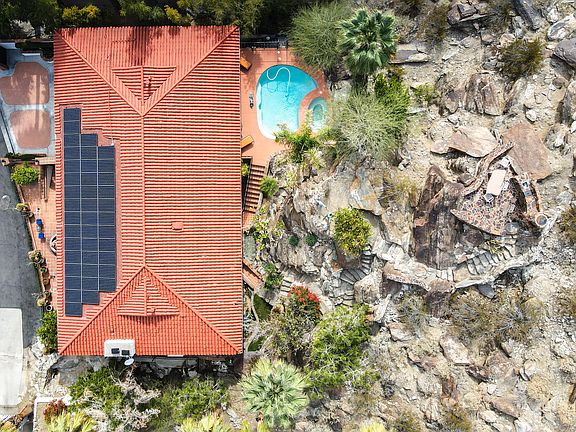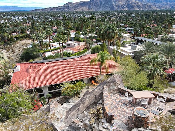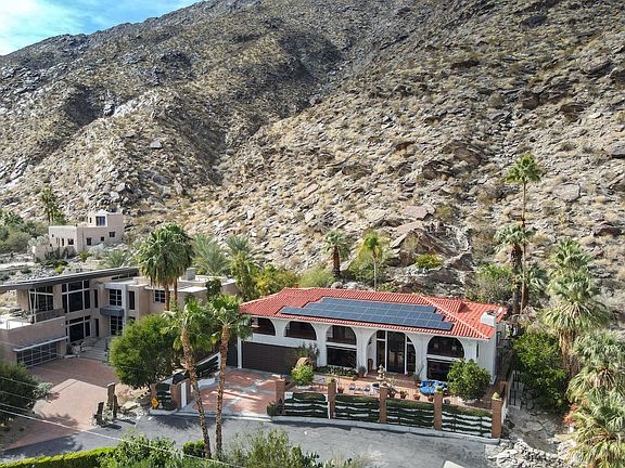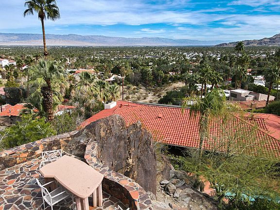 The HOLLYWOOD HILLS of PALM SPRINGS! Sited on the mountain at one of the highest points in The Mesa. This neighborhood is steeped in Hollywood history & home to celebrities past and present. Located in south Palm Springs where you are sheltered from harsh afternoon sun and rushing wind while enjoying a commanding view of the entire valley! For the car enthusiast there is a temperature controlled professional mechanics garage with lift, parking for 6 cars and attached 3/4 bath. For the nature enthusiast you can dine al-fresco while watching big horn sheep graze from a rugged promontory complete with pizza oven. Inside the spacious residence a personal elevator effortlessly takes you between the two floors. First floor living room w/fireplace, generous sized dining room & chefs kitchen which opens onto the den. There is also a walk-in wine vault & first floor powder and laundry room. Custom Spanish tiles adorn the archways. Upstairs in addition to the elegant master suite w/fireplace there is a guest room, office and exercise alcove. On the second level you will also find an authentic English Pub with full bar, on-tap beverages & beer, vintage espresso machine and antique billiards table. This room has east/west exposure opening to the pool area and mountainside to the west and sweeping valley views to the east. Newer HVAC units, a ''safe-room'', 42 panel leased solar system & motorized security blinds complete this unique property. OWNER MAY CARRY. SUBMIT.