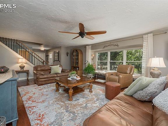 Exceptional property on 2.5 acres with beautiful landscaping located on a cul-de-sac . Main level features formal living room with large window seat and unusually large windows, extremely large dining room with bay window, gourmet kitchen with stainless steel GE Profile appliances, Bosch dishwasher, custom cabinetry, island with 5-burner gas cooktop with downdraft vent, and large pantry. The kitchen walks out to a large deck, perfect for entertaining. Family room has hardwood floors and stone wood-burning fireplace. Well-appointed laundry room with plenty of cabinets connects to garage. Extensive can lighting, custom pendant lighting, and hand-troweled ceilings throughout.   Upstairs offers four generously sized bedrooms with large walk-in closets. Master suite features vaulted ceilings, LVP flooring, ceiling fan, sitting/dressing area, and luxurious 5-piece bathroom with large walk-in shower, deep soaking tub, travertine floors, and custom-made vanity.  West-facing bedrooms offer nice acreage views.  Hall bath includes ceramic tile, custom vanity, and large walk-in shower.   Basement has very large second family room with cozy gas log fireplace, a wall of custom built-in cabinets, wet bar with beverage cooler, dishwasher, sink, and granite countertop, large exercise room with can lighting, wall mirrors and French doors, plus full bathroom with travertine tile.   Attached 2.5-car garage (24'x23') and detached 3-car garage (29'x23') feature shelf systems and pulldown attic stairs with overhead storage. Dog doors from garage to house and to outside fenced area, plus invisible fence system with two collars included.   This peaceful lot has pine trees, evergreens, aspens, manicured front area, hollyhocks, spruce trees, choke cherry trees and brick patio. Decorative Christmas lighting on north and east sides, plus floodlights controlled by upstairs switches for security.Updates include windows, water softener, resurfaced driveway, and garage door on the main house..