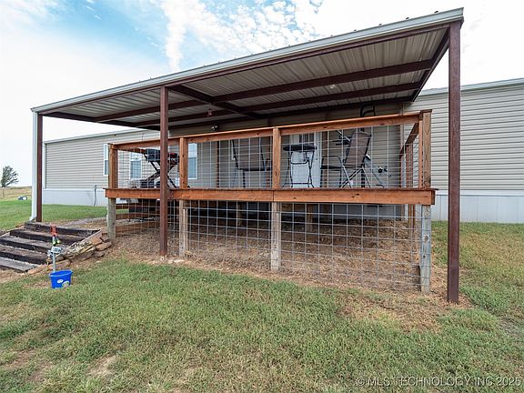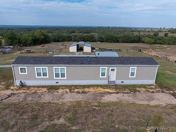The land is fully fenced and thoughtfully improved. A 14’ x 77’ mobile home (approximately five years old) features a spacious 14’ x 21’ covered back porch—ideal for relaxing and enjoying the serene surroundings. A newly constructed above-ground cellar adds secure storage and storm shelter convenience.