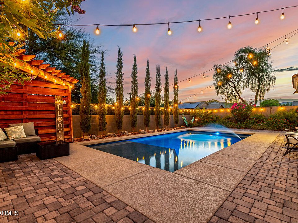 Get ready to fall in love with this exquisite gem! This home invites you in with vaulted ceilings, plantation shutters, and wood-look floors that flow into a cozy living room perfect for gatherings. Kitchen is a true delight with SS appliances, white cabinetry, butcher block counters, a tile backsplash, and a breakfast bar ready for morning coffee. Retreat to the main bedroom, where a bay window, relaxing sitting room ideal for an office, and chic barn doors that lead to a spa-like bathroom with dual sinks, a generous shower, and a dreamy walk-in closet. Outside, unwind in the backyard paradise featuring a paver patio, built-in BBQ, and sparkling pool, just right for entertaining or soaking in the scenic sunset views. This one truly has it all. Don't let it slip away!