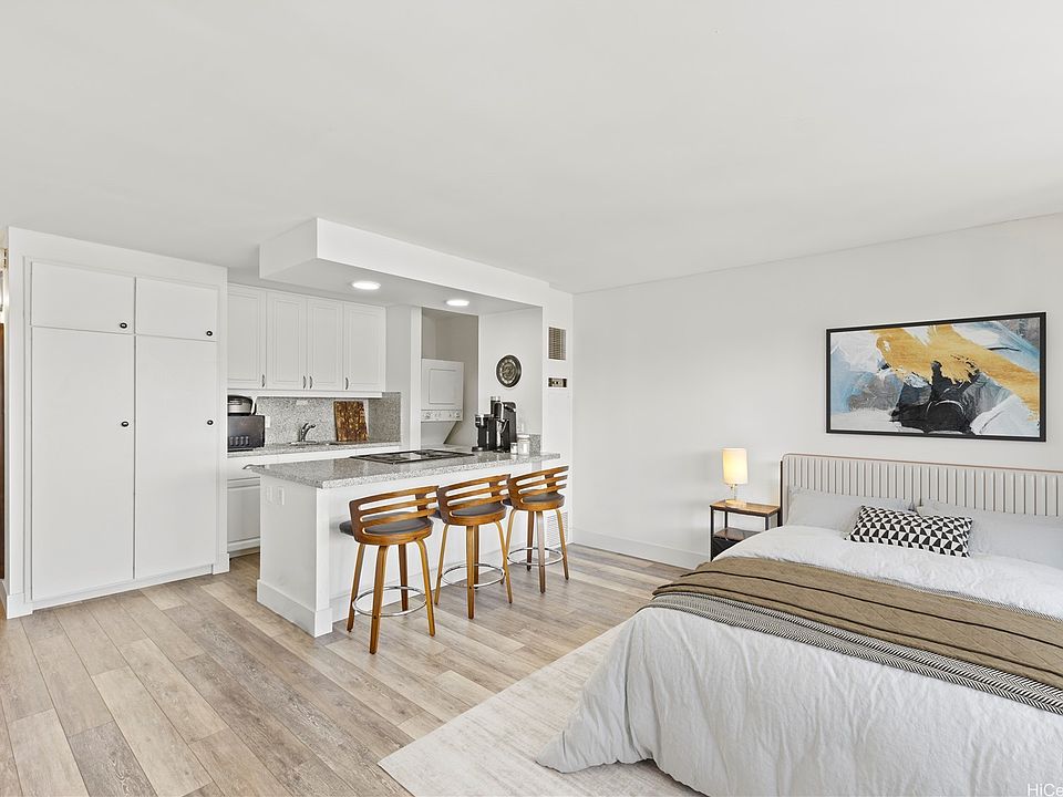 Rare high-floor studio in the iconic Discovery Bay! Unit 3905 in the Endeavor Tower offers the best of island living with sweeping water, city, and mountain views from the cool side of the building. Recently updated and fully furnished, this residence features luxury vinyl flooring, a full kitchen, in-unit washer/dryer, and one assigned parking stall. Enjoy amenities including a pool, spa, sauna, fitness center, BBQ areas, 24-hour security, and full-service management. WiFi and basic cable are included in the maintenance fee. Prime West-End Waikiki location near Ala Moana Center, Ala Moana Beach Park, and world-class dining and shopping. Don’t miss this opportunity—schedule your showing today! The unit is 96.893% fee simple with the AOAO holding both the right and obligation to acquire the remaining 3.107% leasehold interest by December 31, 2039. Lease rent is $22.82/quarter or $7.61/month.