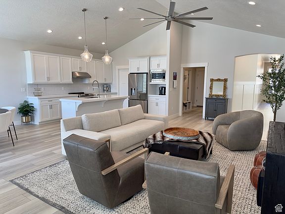 **PLEASE BE AWARE THAT THIS IS A 55 PLUS COMMUNITY AND WE WILL ONLY SELL TO BUYERS OLDER THAN 55 YEARS OF AGE!** Welcome to the Bay View Place Luxury 55+ Community! This Hidden Gem on Provo's Southeast bench is in the perfect spot with panoramic Mountain, Lake, and Valley Views, and it is the ONLY Luxury 55+ development in south Provo specifically for mature residents seeking a peaceful hideaway, but still providing easy access to local amenities. This custom Mountain View floorplan is the development's largest home design with 3,730 finished square feet. This 3 year old home was carefully and deliberately designed with a blend of comfort, style, quality, and craftsmanship using only premium materials and finishes to provide the homeowner with affordable extravagance. This home is intended for single level living with the primary bedroom/bathroom and laundry on the main level along with a guest bedroom and bathroom. Extended family or guests will enjoy the walk-out basement's amenities providing them with 3 bedrooms, 2 bathrooms, a large family room with 6 foot wide game/storage closet, full kitchenette & dining space, along with additional washer/dryer hookups in the large mechanical room. The maintenance-free private patio is accessed from the walk-out basement entrance and is fully fenced with 2 access gates. The west gate opens out into our common area which is a lovely green space with benches and grassy areas meant for relaxing and enjoying the panoramic mountain and Utah Lake views. The main floor also features an additional guest bedroom and bathroom with tile flooring and a walk-in tile shower with bench. The oversized laundry room includes upper and lower cabinets, and a stainless steel utility sink with pull-down faucet. The full size mudroom adjacent to the garage includes a closet, storage shelves, multiple cubbies, coat hooks, and benches. A cozy gas fireplace with lovely herringbone patterned tile surround really adds to the appeal of the open floor plan and vaulted ceilings in the great room. The main level bedrooms also have vaulted ceilings which add to the expansive feel of each room. Gorgeous and roomy kitchen design includes all premium stainless steel appliances including a gas range and stainless hood vented to the outside, a substantial walk-in pantry with power outlets for smaller appliances, and upgraded quartz countertops with brushed nickel faucets and plumbing fixtures throughout the entire home. All of the hardware and lighting fixtures throughout the home exhibit matching brushed nickel finishes. Nearly every aspect of this home has been upgraded including the home's power capacity and electrical panel have been upgraded with 220V supply to support the 220 V power outlet for electric vehicles in the garage, and the Jacuzzi/Hot Tub power connection on the back patio. There is also a gas line located on the rear of the house to connect a natural gas grill. The interior features upgraded LVP flooring, carpet, and pad throughout the entire home. Bathrooms have been upgraded with custom marble and ceramic tile work to enhance the beauty and quality in these spaces. Primary shower upgraded to dual shower heads: one hand-held shower head + waterfall shower head. Upstairs guest bathroom and basement bathroom upgraded to a walk-in showers. Interior features have been intentionally designed to provide the most beautiful and desirable features for our 55+ residents such as two-tone paint, soft-close drawer rails and cabinet door hinges, barn door slider in the Primary Bedroom Suite, and a hidden pocket door to close off the noise from the laundry/mudroom area from the great room. Dual glass doors and dual closets have been supplied for the upstairs guest bedroom/office/den so that the homeowner has flexibility of use for that particular space. Window treatments include real wood, color-matched plantation shutters throughout the home and a mechanized roller blind in the dining area. The Bay View Place Luxur