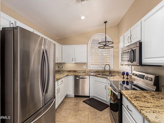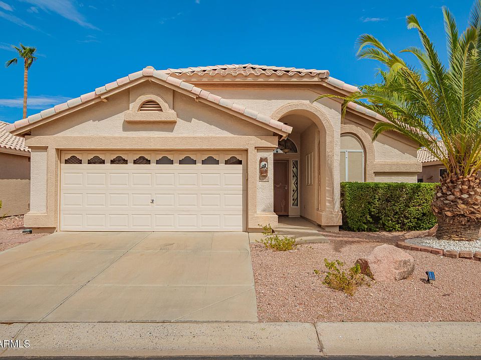LOW ELECTRIC BILLS with Owned SOLAR + PRIVATE SALTWATER POOL! Welcome to this charming home in the desirable Golf course community of Coyote Lakes, offering access to Community Pool, Tennis courts, Pickle ball & a Clubhouse. Inside, you'll find 2 bedrooms and 2 baths, vaulted ceilings, plantation shutters, stained-glass accents, & tile flooring with newer carpet in the bedrooms. The kitchen is a chef's delight with granite counters, ample cabinetry w/under & above cabinet lighting , a smooth-top range, Stainless steel appliances Bosch dishwasher, French door refrigerator. The great room features a cozy fireplace, while the spacious owner's suite boasts dual sinks, a Double walk-in shower, & a generous walk-in closet. The guest room is perfect for visitors or a home office. Laundry room w/cabinet & shelves. Washer and dryer included. Kinetico soft water system with new filters. The garage impresses with epoxy floors and built-in cabinets. Outside, enjoy your own backyard retreat with a sparkling pool with a waterfall , covered patio, TV, and sun shade, ideal for relaxing or entertaining. Low maintenance landscaping with turf. Major updates include a newer AC/Furnace (2019).