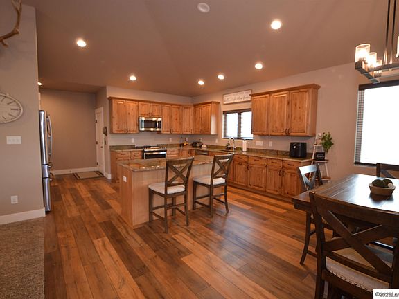 This fabulous home features beautiful granite countertops in a large open kitchen with a great island. Spacious open floor plan with just the right mix of beautiful hardwood floors and comfy carpet. Vaulted ceilings with recessed lighting enhance the open feel. Beautiful on suite with split design dual sinks, deep soaker tub, large shower, and massive walk in closet. 2 more main floor bedrooms are available. Sitting on a corner lot at Laramie Ridge with spectacular views. Large 3 car garage, well maintained yard with play set and freshly stained fence all the way around the back. Come take a look at this one.