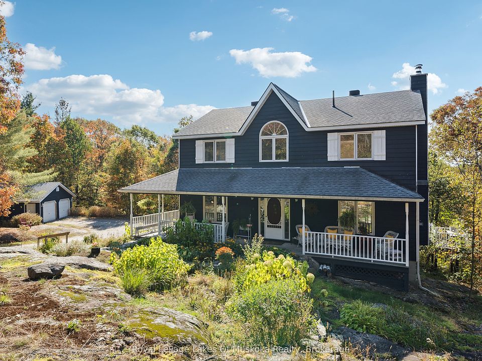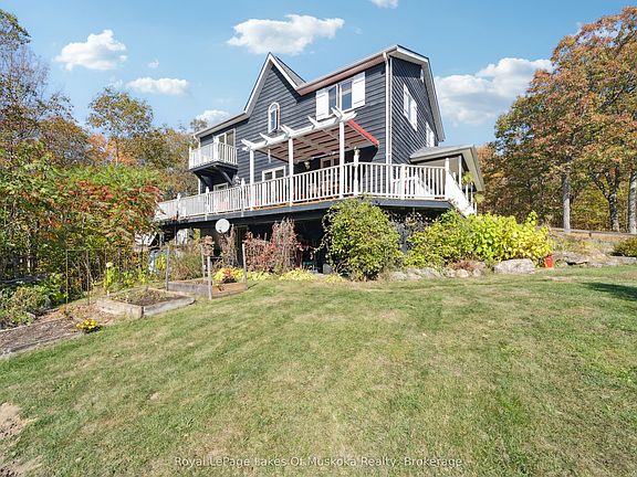 3-BDRM + DEN, 2.5 BATH, 1823 SQFT HOME ON 10 ACRES WITH DOUBLE GARAGE, JUST 6 MINUTES FROM IN-TOWN BRACEBRIDGE PLUS COLLECT OVER $220,000 IN PASSIVE INCOME OVER THE NEXT 15+ YEARS! Step through the covered front veranda into the foyer, complete with double closets. The main floor den provides a flexible space that can easily be adapted into an office, playroom, or an additional bedroom. The expansive living and dining area is bathed in natural light, featuring a wood-burning fireplace and direct access to the wrap-around deck. The eat-in kitchen includes a peninsula with a breakfast bar. A laundry closet and a side-entrance mudroom with a two-piece bathroom add to the home's practicality. The second floor features a large primary bedroom suite with a walk-in closet, a five-piece ensuite with a jetted tub, and a private balcony. Two more bedrooms and a spacious four-piece bathroom complete this level. The property sits on 10-acres of unique landscape of rock outcrops and mature forest, providing exceptional privacy and trails to explore. A detached, 23 x 23 double garage with a concrete floor and hydro can serve as a great workshop. The basement, with its exterior access under the deck, is perfect for storage and houses the home's utilities. This home is conveniently located just six minutes from the shops, restaurants, and entertainment in Bracebridge. It's also only 3-minutes from a Lake Muskoka marina and 1-minute from The Fairways at Kirrie Glen. * * * BONUS * * * Collect over $220,000 in passive income over the next 15 years! Bell Mobility leases a small part of the property for a cell tower and pays over $1000-$1300 each month. The tower can not be seen from the house. The property is still yours to enjoy as you desire.