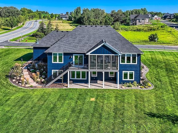 Newly built with high-end design in mind. Open concept living room, dining room & kitchen. Beautiful, vaulted ceilings, decorative beams, fireplace, custom kitchen with premiere SS appliances, custom cabinetry, expansive center island. Main floor owner's suite offers a private 3/4 bathroom with heated floors, walk-in shower & closet, double vanity & tile floors. Also find the laundry room with a sink & desk, office & a full guest bath on the main floor. Step out into the 3-season porch with a fireplace. The lower level offers a family room with a fireplace & rough in for a wet bar, heated floors, 3 bedrooms with walk-in closets & 2 full bathrooms. 4 car insulated heated garage with a sink & stunningly finished floors. Exterior offers impeccable landscaping with concrete edging, concrete driveway, back deck, front porch, back patio,& sprinkler system.