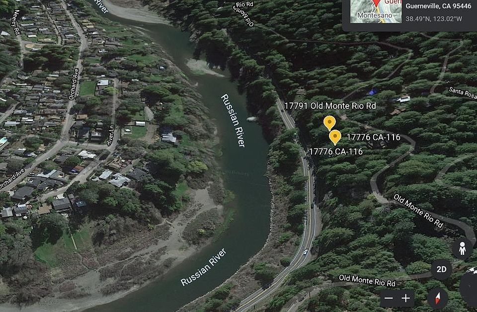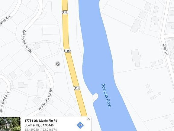 Russian River close-up view with an Old Monte Rio address, but also has direct access steps away across Hwy 116 to the Russian River. Just West of Guerneville, near all the shops. This rare lot offers the opportunity to build slightly up the hill from the river at Hwy 116, or from Old Monte Rio Rd. (Verify with county) Keep your kayak or canoe below for easy access to the river. Owner financing available, with terms. Can be purchased as a package with 17776 Hwy116.