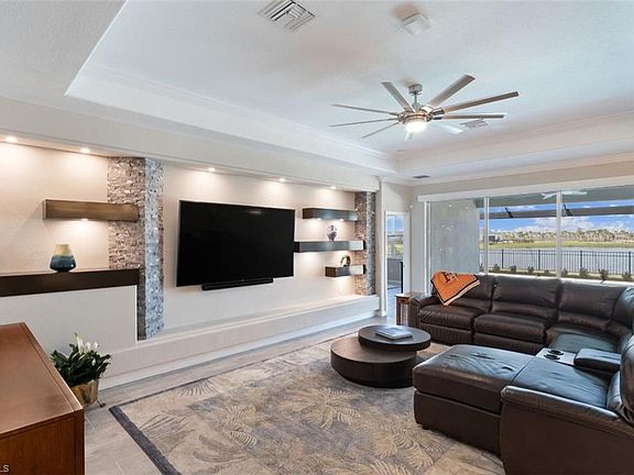 Lakefront livingScreened lanaiCustom wall shelvingElegant upgradesSpacious kitchenElectric shadesStainless steel appliances