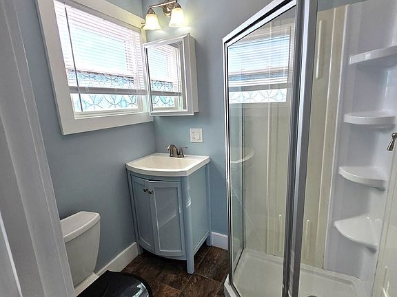 Large bath with a glass enclosed stand-up shower, newer vanity, and wide plank flooring