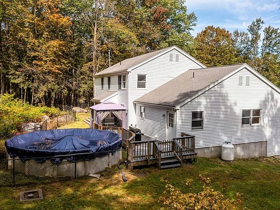 Nestled on nearly 10 acres surrounded by trees, this spacious Colonial offers the perfect combination of privacy, charm and comfort. The updated kitchen with granite counters opens to a warm & inviting living room with woodstove and sliders to the large composite deck & AG pool. The first floor continues with the charming formal dining room with built in cabinets & functional first floor office. Above the 2 car garage is finished space with kitchenette, full bath, and laundry that is ideal for an in-law apartment, guest suite, or studio. The second floor features a large primary bedroom with walk-in closet & full bath, two additional generous bedrooms and a third full bath. The large basement offers plenty of storage & access to the two-car garage. A second composite deck offers picturesque views of the wooded front yard—perfect for enjoying the natural setting. Lots of natural sunlight, beautiful rustic wide plank floors on the first floor and freshly painted interior.