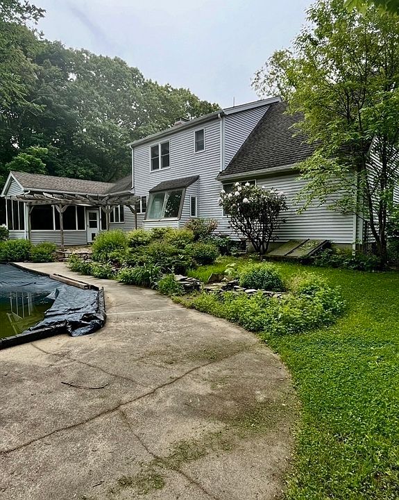 CUSTOM BUILT CAPE sits on a 4.1 ACRE LOT Setting is off the road Borders Barrowsville Pond , Camelot front porch , Nicely landscaped ,perennial bushes and plants , Gunite Pool , Fenced in yard , Screened in attached porch overlooking rear yard , Lofted room overlooks fireplaced living room . Floor to Ceiling fireplace , Plenty of skylights for natural light , many closets and storage , full finished basement w/ 2 utility rooms and office , **heating system is a wood/ coal/ oil furnace **, shelf and closet built ins , wood floors on 2 main levels , 2 car garage w/garage door openers n access to interior , Abuts Barrowvilles Pond ......Your .Private.Overgrown Pathway to access Barrowsville Pond (Bring your canoe , Your kayak , Your chair to enjoy nature -TRULY A MUST SEE
