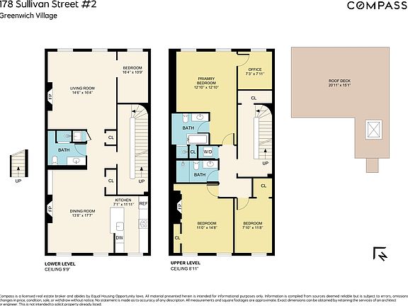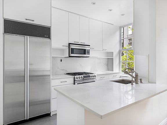 The first level is dedicated to living and entertaining, featuring a spacious layout that begins with a large living room, an alcove den, and a full bathroom. The light-filled kitchen is equipped with designer stainless steel appliances, abundant storage, and counter seating. Just beyond, a chic dining area with a glam wet bar provides the ideal setting for hosting. For evenings that call for dining al fresco, step out onto your private 21' x 15' rooftop deck perched above the treetops, with views of One World Trade and the iconic "Jenga" building. Nearly every room offers serene vistas of the historic MacDougal-Sullivan Gardens, to which you have direct access through the basement - also home to additional storage.