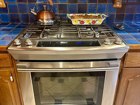 Cobalt blue ceramic tile countertop, backsplash, and flooring. Lots of storage and room to cook and entertain.
