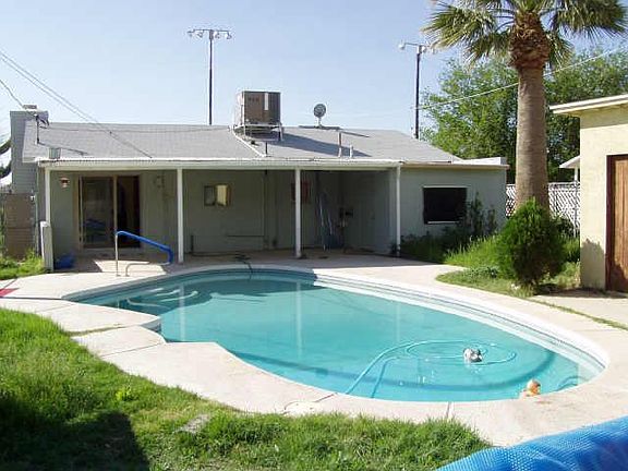 Darling home located across the street from city park. Was 3 bedrooms, owner converted into two bedrooms. New kitchen Cabinets, New tile in living room and hall, newer bathrooms,attached laundry room with washer and dryer, located off back patio. Kitchen appliances stay. Heated pool, work shop with 1 car garage, 2 car carport, storage shed. Front & Alley access. Vacant easy to show. Please leave card.