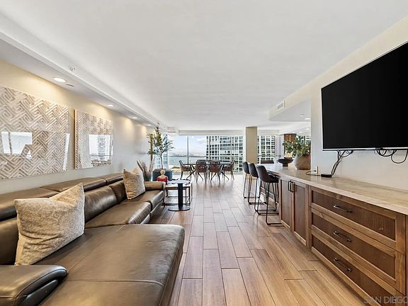Experience luxury coastal living in one of the largest two-bedroom floor plan at The Shores. This beautifully remodeled unit designed by Michael Roy features new windows, automatic blinds, sleek ceramic tile flooring, a stunning "Taj Mahal" quartzite countertop and all high-end appliances. Thoughtfully designed with custom walk-in closets and premium finishes throughout. The unit is being offered furnished, making your move a breeze. A rare opportunity to own in La Perla tower, one of Coronado Shores most desirable buildings.
