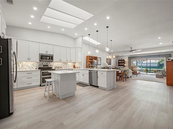 Coastal elegance blends seamlessly with casual comfort in this exquisitely remodeled 3 bedroom, 2.5 bath Paradise Garden Villas home in Punta Gorda Isles, one of Southwest Florida’s most sought-after boating and golf communities. Upon entry through a private courtyard area you are captivated by the expansive wide open floor plan and vaulted ceilings reaching almost 12 ft. in height. A cool coastal color pallet coupled with driftwood style plank laminate flooring further enhance the spaciousness of this floor plan. Masterfully redesigned to enhance the abundance of open living space while capturing lake front vistas beyond, your entertaining options are unlimited. Kitchens area a focal point, and this one will not disappoint with its attention to detail. Shaker style cabinetry affords an abundance of storage space and is complimented with decorative hexagonal tile backsplashes with metal accents, stainless steel appliances, exquisite quartz counters, and a prep island to display your culinary dishes. A combination of new energy efficient skylights, together with recessed and decorative pendant lighting, add to the dramatic illuminating effects that showcase this focal area. Your guests will enjoy the spacious living room area that is serviced by a wet bar with wine refrigerator and features the same decorative appointments found in the gourmet kitchen. The bedroom suites offer a unique ambiance of their own, with the primary suite opening to the screened in lanai area, and capturing those tranquil lake vistas beyond. The primary bath has been luxuriously remodeled and offers a perfect way to relax at day’s end with an expanded walk-in shower featuring contrasting tile insets and multiple shower heads all behind a wall of clear glass. The dual sink vanity carries the same color palette found in the kitchen with its shaker style cabinetry, quartz counters and European style fixtures and hardware. These same clean line upgrades have been carried forward in the guest bath and half bath as well, adding to the luxurious accommodations your guests will enjoy. The second guest bedroom suite with its desk and array of built in cabinetry, is expansive in size and offers multi-purpose options from a bedroom with office space to a crafting room or den. Florida is known for its outdoor activities and social get-togethers which include barbeques and evening dinners, all of which you can enjoy on your private 16’x35’ screened lanai overlooking one of the community’s private lakes. For the car enthusiast or hobbyist, the oversized 22’x22’ garage with epoxy non-slip flooring is perfect for the enjoyment of your special interests while still having enough room for a small workshop. In addition to all these featuresand refinements this home comes with a NEW METAL ROOF (2024), NEW ENERGY EFFICIENT SKYLIGHTS (2024), EXTERIOR PAINTING (2024),NEWER AIR CONDITIONING (2020), NEWER WATER HEATER (2019), NEWER APPLIANCES (2019), ALL IN ADDITION AND MORE AS PART OF THE COMPLETE RENOVATION (2019). IN ADDITION, THERE WAS NO FLOODING OR HURRICANE DAMAGE FROM THE RECENT STORMS. Enjoy historic Punta Gorda’s waterfront parks, restaurants, shops, the famed Fisherman’s Village, year-round farmer’s markets, and St. Andrews South golf course just across the street with a membership second to none. This is your opportunity as Paradise Garden Villas is a very social community, and this home is more than just a show place, it is a place where memories are made.