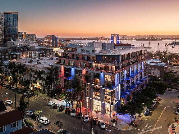 Welcome to DOMA’s most iconic residence! — In the heart of Little Italy with award-winning restaurants, vibrant farmers markets and the bay front, just steps from your front door. This stunning corner unit boasts a generous wraparound balcony with sweeping city and ocean views. Exquisite features include: dramatic 18-foot double vaulted ceilings, exposed concrete walls, expansive floor-to-ceiling windows, Villa Barcelona hickory wood floors with Rosso Levanto marble borders and brass inlays, an 18 foot living moss wall and halogen tech lighting including a stunning entry fixture designed by the renowned Isamu Noguchi. The home is fully automated with the finest technology: Savant home automation of all audiovisual systems, lighting and custom automated drapery with retractable window screens. The center kitchen is a chef’s dream, outfitted with integrated Fisher & Paykel appliances, a Brazilian quartzite floating island and custom African mahogany cabinetry. Ascend the diamond metal plate staircase to an open-air primary retreat with custom-forged iron & glass railings and custom automated drapery throughout. and a custom walk-in closet by California Closet Designs. An AWOL Vanish Laser TV remains fully contained in custom cabinetry when not in use, preserves the unobstructed views of Little Italy from the bedroom. The bathroom sanctuary boasts Calacatta Viola marble countertops, a standalone soaking tub, a walk-in shower and a separate toilet room. The home is furnished with designer pieces from Roche Bobois and RH for a flawless finishing touch! This exceptional home includes two oversized side by side underground parking spaces and a rare and valuable 170-square-foot storage room. Residents of DOMA enjoy top-tier amenities, including a fully equipped fitness center, rooftop terrace with barbecues & sweeping ocean views, secure bicycle storage, and a stunning lobby enhanced by a state-of-the-art access control system. DOMA stands proudly in the heart of Little Italy — offering what is arguably Downtown San Diego’s most coveted address.