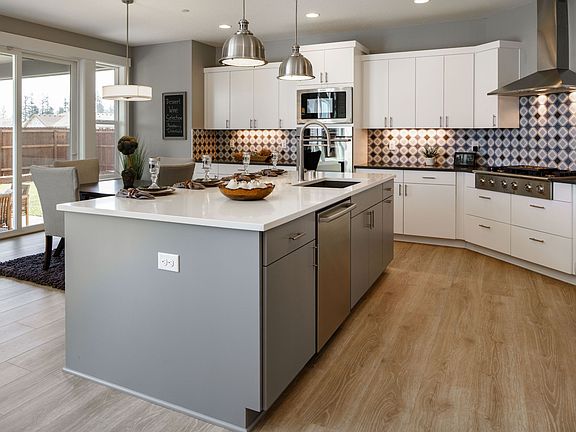 The Shasta and the Shasta XL are appealing home designs, and with the Shasta XXL, you get even more additional upstairs living space. The Shasta XXL offers homeowners plenty of great options with three to five bedrooms, 3.5 to 4 bathrooms, a three-car garage, and 3756 square feet of living space. There are also multiple elevations, all of which complement the aesthetics of the Pacific Northwest. This is an excellent choice for those who want even more flexibility, options and space.The first floor of the Shasta XXL is just like the Shasta, which is already a fantastic home design in its own right. From the well-lit entry with transom and side windows surrounding the front door, an elegant coffered ceiling hallway leads you into the home. Along the hallway, you'll find an arched entrance to the dining room on one side and the standard den on the other side. For those preferring additional bedrooms, it is possible to convert the den into a bedroom.As you continue down the hallway, you'll find another arched entrance that leads into a smaller hallway that includes access to the powder room on one end, and access to the master bedroom suite on the other. Arched entrances lead to both spaces adding to the beauty of the home's interior. There is also the option to turn the powder room into a full bathroom when the den is used as an additional bedroom.