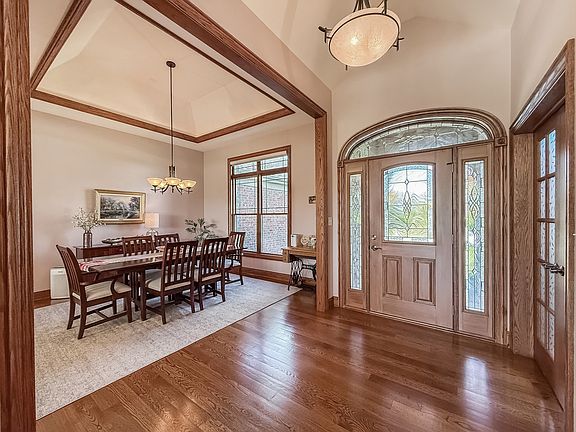 Beautiful all brick custom-built split bedroom ranch ideally positioned along the scenic par 3 8th hole of Blackstone Golf Course. Blackstone is the county's most highly regarded semi-private course featuring 18 holes of championship golf, a full bar and restaurant, and a complete practice range. Enjoy picturesque views of the water and green without the worry of errant tee shots as this home is tucked well away from the green. Inside, you'll find soaring 10'+ ceilings with exquisite millwork and tray details throughout. The foyer welcomes you into a spacious great room that overlooks the course and flows seamlessly into a chef's kitchen appointed with quartz counters, stainless steel appliances, double ovens, and ample cabinetry. The primary suite offers a luxurious retreat with dual walk-in closets, a double vanity, separate tub and shower, and beautiful tile finishes. Two additional bedrooms, each with walk-in closets, share a well-placed hall bath. A front office with french doors and a formal dining room provide both function and sophistication. The screened patio off the kitchen creates the perfect spot to relax and enjoy the golf course views. The walk-out basement is unfinished but includes a full bath rough-in, patio access, and endless potential for future living space. Additional highlights include 2x6 exterior walls, a large laundry/mudroom, an oversized 3 car garage, exceptional storage throughout, fire suppression and outdoor sprinkler systems, as well as professional landscaping that compliments this meticulously maintained home. Located just minutes to I-90 this home is a dream for those commuting or the frequent traveler!