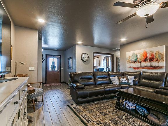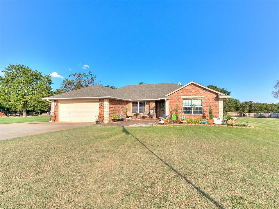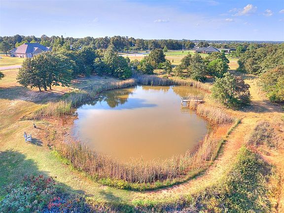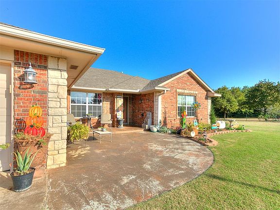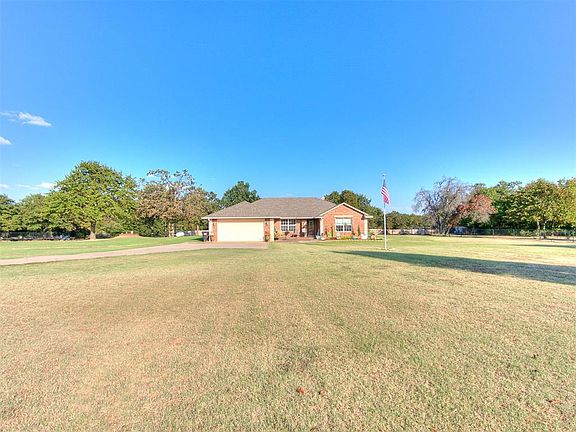 Welcome to your dream home in Sunset Estates — where modern comfort meets country living on over 5 acres. This beautiful property offers a 40x60 shop, 3 bedrooms, a dedicated office, 2.1 baths, and a 2-car garage, all surrounded by wide-open views and peaceful scenery. Enter inside and enjoy an open-concept kitchen with granite countertops, stainless steel appliances, wood-look tile floors, and under-cabinet lighting, flowing seamlessly into the living room with a cozy brick fireplace and large windows overlooking your land. The master suite is a true retreat with a private door to the backyard, newer carpet, ceiling fan and a remodeled spa-like bath with granite counters, dual sinks, a rain shower, and a walk-in closet. Two additional bedrooms with a attached bathroom, plus a dedicated office and guest half bath, make entertaining easy. Outside, this property has everything you’ve dreamed of — a 40x60 insulated shop with electric, plumbing, WiFi wiring, and its own workout or office space, a pond stocked with catfish and bass, a fenced dog area, room for livestock, and your own orchard with peach and apple trees. Complete with a storm shelter and located just 25 minutes from Tinker Air Force Base, this home is more than a property — it’s the lifestyle you’ve been waiting for.