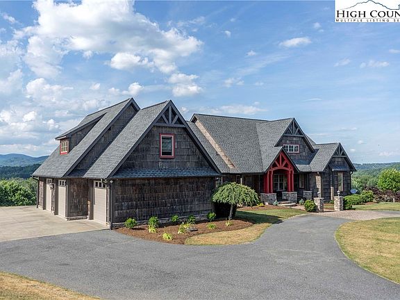 Nothing transcends the beauty of this stunning estate. Only 1.7 miles from U.S. 421 and just minutes from downtown Boone, great restaurants, boutique shopping, cultural and sporting events, convenience and serenity are yours to enjoy. The estate is comprised of 18.95 acres, long-range layered mtn. views, beautiful pastures and a custom-built, bark-sided home. Constructed using the finest materials such as Ipe wood for decking and copper guttering, this well-built and beautifully landscaped home does not disappoint. A stone and brick entrance takes you from the circular drive to the covered front porch. Inside a spacious foyer leads to an open floorplan boasting a great rm/w vaulted ceiling, stacked stone fireplace, dining area, gourmet kitchen w/walk-in pantry, sunroom/breakfast room, spacious laundry, home office and a large mud rm that opens into an oversized 3 car garage w/ half bath. The great rm & sunroom open to the covered back deck and gorgeous long-range views. An elegant main-level primary bdrm., ensuite bath w/ heated floor, walk-in shower, 2 vanities and 2 walk-in closets also features an enclosed porch with stone fireplace for relaxing, reading and enjoying cool summer evenings. A flex rm and full bath complete the main level. An additional 2 bedrooms., full bath, family room with stone fireplace. TV/Rec room and 2 large storage rms are in the finished lower level. In addition, an unfinished area over the garage offers the opportunity for an additional living space. Other amenities include a barn style outbuilding, tranquil fenced garden area with potting shed, blueberry bushes and plum trees. The property lends itself to future development with the possibility of numerous additional building sites, suitable for a family compound or horse farm. Owner will consider owner financing to qualified buyers. Seller is also open to negotiations for the purchase of adjoining lot#1, Wildwind Development Tax ID # 2911951320000 w/ the buyer for 1781 Brookshire Road.
