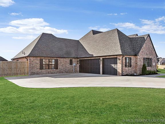 Discover your dream home in Magnolia Heights, nestled in a quiet cul-de-sac within the coveted Bixby West school district! This stunning 2023 custom-built executive home is packed with upgrades and offers luxurious one-level living, including a fully equipped mother-in-law suite. The spacious open floor plan features an elegant office, soaring stone fireplace, farmhouse sink, and custom lighting throughout. Enjoy outdoor living on the vaulted covered porch overlooking a huge, fully fenced lot with a sprinkler system and French drains. The oversized 3-car garage boasts epoxy flooring, a storm shelter, and is pre-plumbed for a water softener. Designed for comfort and efficiency, this home includes a extra insulation, gutters, and high-tech pre-wiring for cameras, sound, and upgraded carpet padding. Don't miss this rare gem! Schedule your private showing today!