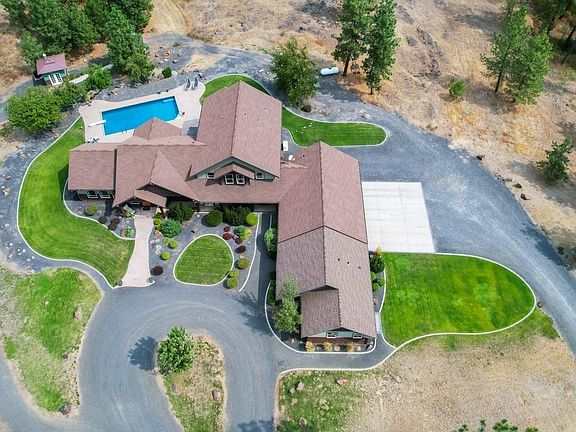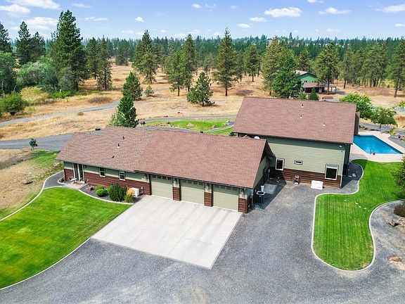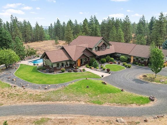 EXCEPTIONAL HOME! 1-1/2-story lodge-themed craftsman rancher on 20 acres with exquisite mature landscaping. 4,654 SF, 5 BR, 4 bath, media rm, 2 family rooms, diving pool w/stamped concrete, Bullfrog spa, waterfall feature and custom pool equipment shed. 80âEUR(tm) x 48âEUR(tm) shop with 400-amp service, 16-ft OHDs & heated/cooled gun range. Irrigated garden with heated/ventilated greenhouse. 3 car garage & pond. Great room w/cathedral ceilings, log columns/beams, wood floors & custom fireplace. Kitchen w/live edged slab granite, hickory cabinets, professional stainless appliances & prep sink. Main floor master with two walk-in closets, double sinks, and soaking tub. 1,000 SF ADA apartment-kitchen, full bath, bedroom, and great room. 22KW generator with auto-transfer. 17-zone sprinklers, steel security lift gate & CCTV. Timber/mountain views & only 15 minutes to Spokane. Adjacent 20-acre parcel with large year-round pond & ca.1909 dairy barn is also available for purchase; reduced price for same-buyer, same-day close.