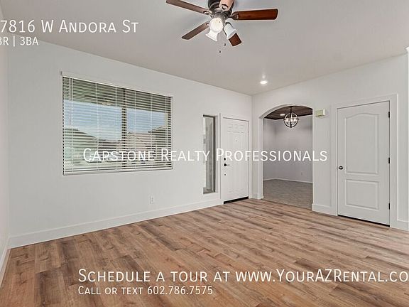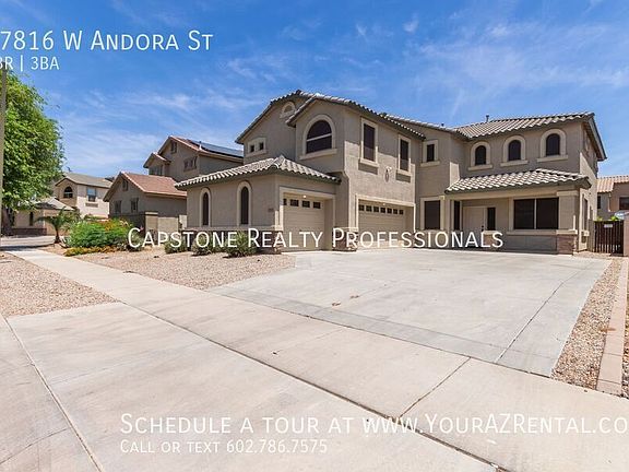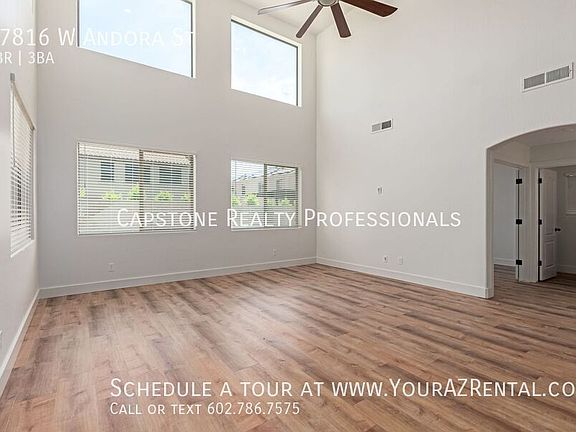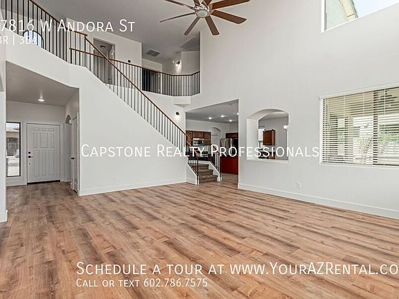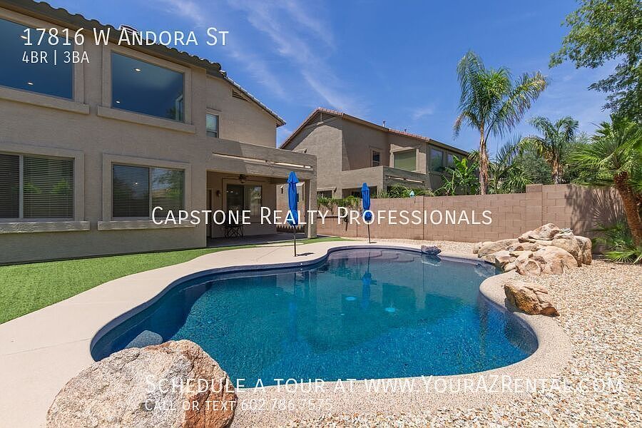 This beautiful 4-bedroom, 2.5-bathroom home in Surprise, AZ offers a thoughtful blend of functionality and style, with tall ceilings, a wall of floor-to-ceiling windows, and an abundance of natural light throughout perfect for anyone looking for space and comfort living in a prime location. Key Features: Flexible Living Areas: Soaring ceilings and a main-floor office provide the perfect setting for working from home, studying, or pursuing creative hobbies. Stylish Kitchen: Rich wood cabinetry, upgraded stainless steel appliances, granite countertops, and a spacious kitchen island make this a dream for home cooks and entertainers alike. Upstairs Loft & Spacious Bedrooms: The second level features a loft area and roomy bedrooms, providing plenty of flexible space for lounging, hobbies, or a playroom. Primary Suite Retreat: Relax in the spacious primary bedroom with a walk-in closet, double sink vanity, separate soaking tub, and walk-in shower, your private escape at the end of a long day. Backyard Oasis: The large backyard is designed for entertaining, complete with a sparkling pool, room for seating, and space to host unforgettable gatherings. Laundry Included: Washer and dryer are conveniently located inside the home for added comfort and ease. Prime Surprise Location Nestled in a quiet neighborhood near local schools, parks, shopping, and dining, this home is a peaceful retreat that doesn't sacrifice convenience. Whether you're working from home, entertaining guests, or just relaxing by the pool, this Surprise stunner offers the best of Arizona living. Schedule your private tour of 17816 W Andora St today and see what makes this home truly special! -- Monthly Residential Benefit Package: $49.99 Security Deposit: Equal to one months rent Refundable Cleaning Deposit: $400.00 Refundable Pet Deposit: $200.00 per pet Carbon Monoxide Detectors Dryer Pool Non Heated Separate Shower And Tub Smoke Detectors Washer Wood Floor Tiles