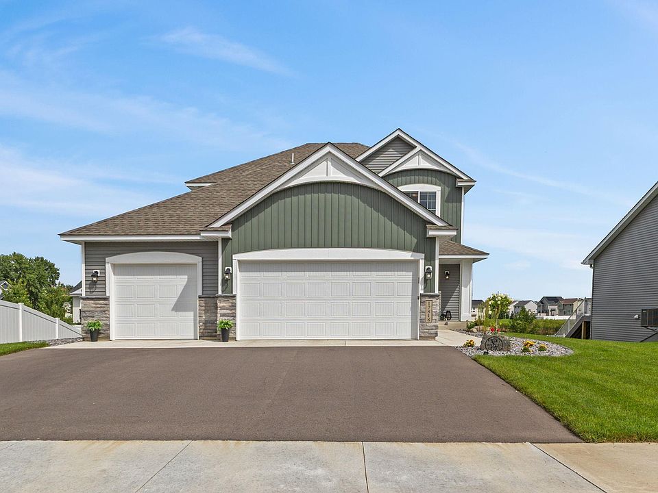 Welcome to your gorgeous 2024 Keyland-built home! This gorgeous two-story welcomes you with an impressive custom exterior color palette, featuring stamped concrete edging along the driveway and extra wide concrete apron. Head inside and be impressed with stunning selections throughout. The floorplan here in the 'Newbury' just flows - from wide open entry, to functional half bath, and an incredibly laid out great room that spans to your designer kitchen. Your living room features a lovely floor to ceiling shiplap electric fireplace and large windows that give you a GREAT view of the gorgeous pond lot. Warm, wood tone LVP ties this entire space together. The kitchen features custom selections, like two-tone cabinetry, great light fixtures, and quartz counters. Through the mudroom, find a dual purpose main level bedroom OR office, as well as a functional built-in bench. Upstairs, find three bedrooms on one level, including your lovely primary suite. Laundry is also located up here for easy access! Down to the basement, you'll find FINISHED space (rare for this pricepoint in new construction!) with an additional bed/bath. The family room features a rough-in for a future wet bar! Out through your walkout basement, a brand-new stamped concrete patio awaits. All of this with a Lakeville address?! Say it with me: HOME.