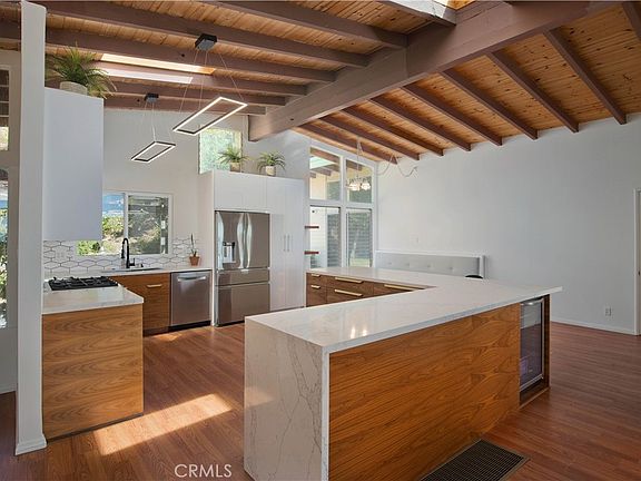 Set high above the street with captivating deck and living room views, this light-filled mid-century modern gem is a blend of style and comfort. Step inside to discover an open-concept layout featuring a fully remodeled kitchen that flows seamlessly into the high-ceilinged living room, ideal for both entertaining and everyday living.