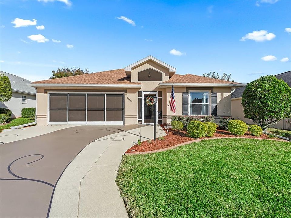 STONECREST is a 55+ Golf Course Community With All The Amenities, and just a Bridge Away By Golf Cart To The Villages! Stunning Concrete Block and Stucco 3/2 Pebble Beach Villa with a 2 Car Garage! This Charming home offers a New HVAC 2024, No Carpet, an Open Concept Floor plan, and Tremendous Curb Appeal featuring Meticulously maintained Landscaping, Painted Concrete Driveway and Walkway, and an Enclosed, Covered Front Entrance with an Elegant Leaded Glass Door! Upon entering into the foyer, you are greeted by the Dining and Living area combination (currently set up as a huge living area) showcasing a Gorgeous Upgraded Designer light fixture, Vaulted ceiling and laminate flooring. The Dining and Living area combination create a Spacious gathering area, perfect for entertaining family and friends! The Living area flows seamlessly through stackable sliding doors to the Expanded Covered Lanai with a Stamped concrete floor, and Large Birdcage enclosure, Enhancing the Outdoor Living Experience! The Large Eat in Kitchen is bathed with natural light featuring Vaulted ceiling, Laminate flooring, a Pantry closet, Quartz countertops, beautiful Tile backsplash, Stainless Appliances, plenty of Wood cabinets with pull outs, and a nice size breakfast nook! The Luxurious Primary bedroom offers Luxury Vinyl Plank flooring, Two Closets (One Walk In, and One a Double), and an En Suite bathroom. The En Suite bathroom boasts a Double Sink Vanity with a Granite countertop, Separate Water closet with a Comfort High Commode, and a Tiled Walk in Shower. The Second Bedroom features a nice size built in closet, Cellular Blackout Shades, Laminate flooring, and the Third Bedroom provides a built in closet, offering plenty space for your guests, with the Guest bathroom showcasing a Granite topped vanity, and a Tiled Tub/Shower combination. This Stunning Pebble Beach Villa has Plenty of privacy, with No Rear Neighbors, and Privacy landscape, which provide a lovely park like setting for your backyard BBQ's! The generous size 2 Car Garage features a beautiful painted concrete floor. (Golf Cart does Not Convey). Stonecrest is a 55+ gated golf course community with all the amenities, pools, pickleball courts, softball, 18 hole championship golf course, Broad Stripes Golf & Social Club and over 80 different clubs to join! Stonecrest is just a bridge away by golf cart to the Villages. It is a community with Private Roads and 24 Hour Security! As a private gated golf course community, you can expect a high level of privacy and security. Overall, this home offers a combination of Tremendous Outdoor Space, luxurious features, a desirable location, and a secure community setting. A WONDERFUL LIFESTYLE AWAITS YOU IN STONECREST!