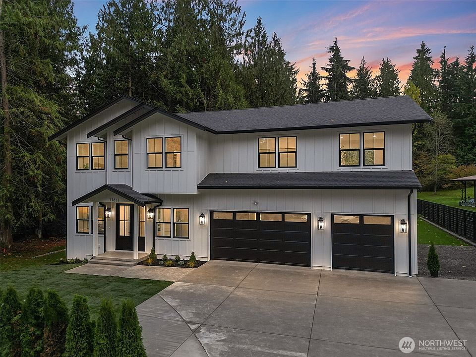 Welcome to this beautiful new construction 4-bedroom, 3-bath modern farmhouse with a 3-car garage and RV/boat parking on a peaceful 1-acre lot in a quiet neighborhood. Home blends timeless craftsmanship with modern luxury. Enjoy a welcoming mudroom with custom built-ins, a private office with French doors, and a bright living room filled with natural light and forest views. The gourmet kitchen offers a walk-in pantry, quartz counters, and high-end finishes. The spacious primary suite includes a spa-style bath with a freestanding tub overlooking lush greenery. Upstairs bonus room perfect for a gym, studio, or playroom. Gorgeous engineered hardwood floors throughout. Property backs to public land for privacy and endless outdoor enjoyment.