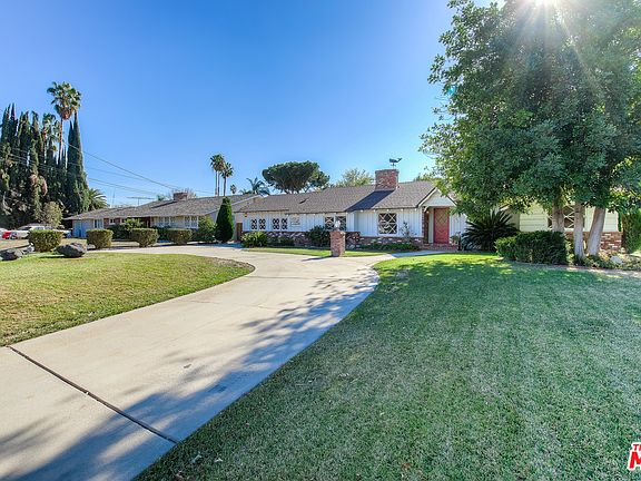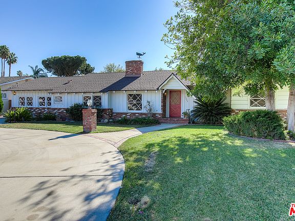Nifty Northridge Ranch needs Family! Secluded Single Story Pool Home Located on a quiet cul-de-sac. Beautifully manicured corner property has a charming Cinderella Curb appeal with circular drive-way. Generously-sized 0.33 acres lot ensures comfortable ranch-style living within a city. Move-in ready with classic floor plan: 3 bed, 2 baths, separate family room & den with plenty of room for sleep, study or storage. Interior highlights include hardwood/tile floor, central HVAC, central vacuum, several built-in'. Master features: walk-in closet & en-suite bathroom, the kitchen, guest bath have original design. Living/dining room has vaulted ceiling w exposed beams, fireplace, plenty of windows, a double French door opens up to a spacious backyard. Tranquil courtyard perfect for entertaining, relaxing, and enjoying outdoor living. The brilliant pool is cost-effective heated by solar/gas. Two car garage has ample storage space. Separate bonus/rumpus room can be used as a music studio/office