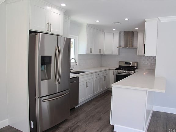 Spectacular completely remodeled home on quiet street! Amazing curb appeal! Gated front yard with brick and wrought iron. Concrete driveway with brick ribbons lead to shiny front door. Inside you will find open concept living. Most everything is new. New wood like engineered flooring, new paint inside and out - soothing decorator colors. Smooth ceilings, recessed lighting and dual pane windows. Newer HVAC system. Brand new stunning kitchen with breakfast bar. crisp white cabinets, stainless hardware, quartz counters, subway tile backsplash, Stainless steel appliances include refrigerator, microwave, dishwasher and 5 burner gas stove with free standing hood. Open and bring living and dining with decorator fixture. Thick crown and base molding. Panel doors and stylish hardware. Indoor laundry room includes brand new washer and dryer! Stunning custom bathrooms totally redone. The master bedroom has a private bath with marble counters and white cabinet. Custom tiled walk in shower with glass enclosure. Tankless water heater. Decorator sharp and done with elegance. Private backyard boasts concrete decking, new pergola and re-plastered/re-tiled swimmers pool. Brand New roof! 2 car garage is a bedroom for the cars with finished floors and drywall. Amazing showplace!
