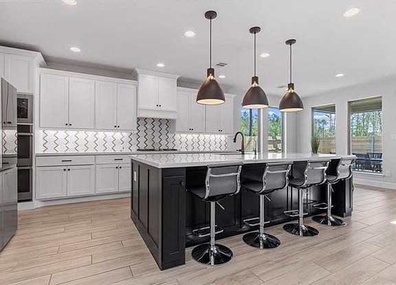 The home nestled in a private cul-de-sac of serene Artavia, with no rear neighbors. A two-story floor plan with modern amenities and upgrades. The entry features a 20-foot ceiling. French glass doors lead into a private study, while the formal dining room opens to an iron rotunda staircase. The open concept is adorned with a wall of windows and a custom fireplace. This area transitions into the gourmet kitchen, with a generous quartz countertop island, tall custom cabinets, double ovens, a 5-burner range, and a walk-in pantry. The first-floor primary suite shows a curved wall with a sitting area. Bathroom with dual vanities, tub, shower, and two walk-in closets with direct access to the utility room. The first-floor guest room includes a private bathroom. Upstairs, you’ll find a game room, media room, and two guest bedrooms. Additional features include eight-foot doors throughout all first-floor rooms, a mudroom off the three-car garage, a sprinkler system, and a large covered patio.