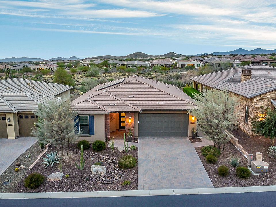 PRICED TO SELL FAST - Resort Living at Trilogy Verde River Gated Golf Community. Luxurious 2 bedroom home plus extra Den/Bedroom with murphy bed, double doors and built-ins convenient for extra guests. Entertain in the gourmet kitchen with Monogram appliances, upgraded cabinets, expansive island, quartz counters and pantry. Well-designed great room with 15' multi-slide door with a screen that opens to a covered area with fireplace and spectacular view of Four Peaks from the firepit in this spacious lot backing to a natural area. Spacious primary ensuite w/ large walk-in closet. Laundry area upgraded to spacious Smart Space. Garage with space for 2 cars and golf cart has custom cabinets. Plus: Solar Panels, remote-controlled blinds on patio door, window blinds, water softener, RO Sys Experience Trilogy at Verde River, a stunning resort style community nestled against the beautiful Tonto National Forest. The amenities at Verde River are spectacular. The Community boasts an 18-hole Championship Golf Course with a picturesque driving range, putting green, and separate chipping/pitching practice areas. One visit and you will understand why the PGA Southwest Section selected Verde River Golf & Social Club to host the AZ Senior Open and AZ Match Play Championships in 2020, 2021 and 2022. The active lifestyle amenities continue with pickle ball and tennis courts, with Clubs designed for social or competitive play. Adjacent to the sport courts for your convenience are bocce ball courts and an open grass area for social gatherings.