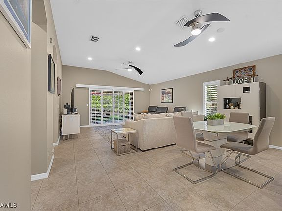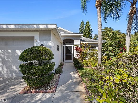Exceptional CORNER home on the LARGEST lot in the community! Nestled on a spacious quarter-acre of land in a NO FLOOD ZONE, this stunning 3 bedroom/2 bathroom home offers a unique outdoor entertaining space & beautiful upgrades inside. Outside, stone walking paths connect multiple seating areas & several outdoor tile patios. An extensive garden features mature oak, palm, and pine trees. Updated, well-kept landscaping & bushes surround the property for added privacy. A large screened-in outdoor lanai features several seating & dining spaces, as well as a fire pit, with a newly constructed 10 ft. high hurricane strength frame net. While the outdoor space is a main highlight, this home has plenty more to offer inside with neutral colors & updated design. Upgrades in the large, open kitchen include new custom cabinetry, granite countertops, stainless steel appliances, & a pantry. Plantation shutters have been added in the main living spaces, as well as new fans & recessed lighting, & a 2023 AC. Large windows and high ceilings throughout allow for plenty of light & bright open space. A large & bright primary bedroom offers a generously-sized walk-in closet & a newly remodeled ensuite bathroom with dual sinks & a walk-in shower. The sellers have taken meticulous care of the home & made it move-in ready for the new owners with many updates in essentially every room. Despite being tucked away, this home is ideally situated near US-41 and I-75, providing easy access to some of Southwest Florida’s best beaches, restaurants, & shopping, along with convenience to RSW International Airport, medical, & schools nearby. This home presents a rare opportunity to own a quarter-acre corner lot tucked on a quiet street, while still being in an ideal location that keeps you connected to everything you need.
