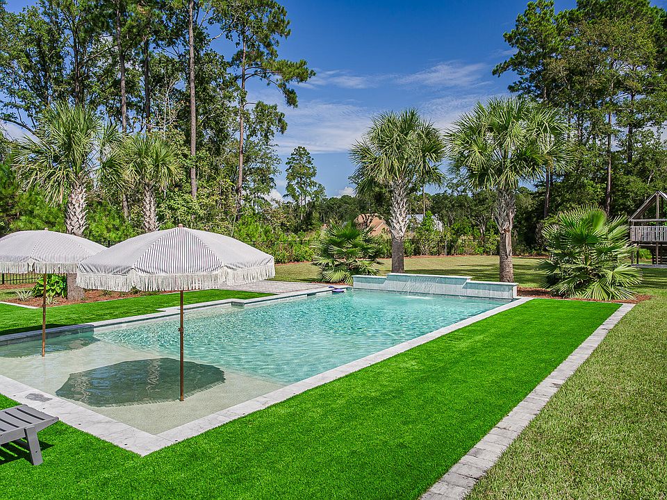 Set on an expansive 0.56-acre lot--one of the largest and most private in Riverside--this 3,344sq. ft., 4-bedroom, 3.5-bath home backs up to protected woods, wetlands, and HOA green space, offering a peaceful Lowcountry setting. Upon entering, you're welcomed by a spacious primary office that flows seamlessly into a custom-built bar area. The office could easily serve as a fifth bedroom or guest suite if desired.At the heart of the home lies the open-concept living room and kitchen, where natural light and easy flow define the space. The kitchen features two-tone cabinetry in navy and white, a farmhouse sink, double ovens, a gas cooktop, and premium finishes with professional-grade appliances. **Owner is a licensed South Carolina Real Estate Agent**A butler's pantry and coffee bar add prep and storage space, while a second office or flex room off the kitchen provides functionality for modern living. Just beyond the kitchen, a large downstairs bedroom offers abundant natural light and views of the pool and backyard oasis. This bedroom includes its own en-suite full bath, making it ideal for guests, extended family, or multi-generational living. Step outside to your private backyard retreat, complete with a heated and chilled saltwater pool with waterfall, surrounded by artificial turf, custom pavers, and lush professional landscaping. The entire backyard is fenced and thoughtfully landscaped along the perimeter, ensuring both privacy and beauty from every angle. A large screened porch overlooks the pool, offering the perfect space to unwind in serenity or gather with friends to watch the big game. The grounds are supported by a 16-zone irrigation system with a dedicated irrigation meter, keeping everything vibrant year-round with ease. Upstairs, the primary suite offers a serene escape with views of the pool and protected woods. It features his-and-hers closets and a spa-inspired bath with soaking tub, frameless glass shower, and dual vanities. A finished laundry room, two additional bedrooms, and a large bonus room complete the upper level, providing ample space for family, guests, or recreation. Located in Riverside at Carolina Park, one of Mount Pleasant's most sought-after communities, you'll enjoy access to scenic trails, neighborhood parks, a community pool, and top-rated schools, all just minutes from beaches, shopping, and dining.