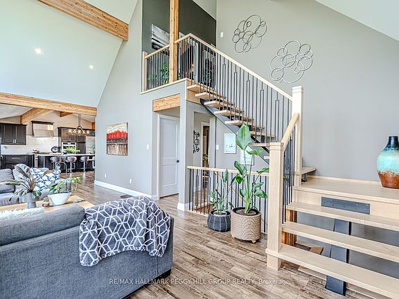 BOLD ARCHITECTURE, LUXURY UPGRADES, A HEATED 3-BAY SHOP, & SEPARATE 200 AMP SERVICE TO BOTH THE HOUSE & THE SHOP ON OVER HALF AN ACRE OF COUNTRY LIVING! Step into this 2019 Linwood home offering over 3,300 sq ft of finished living space on a beautifully landscaped half-acre lot, just minutes from downtown Elmvale. Enjoy an unmatched lifestyle close to Wasaga Beach, the Elmvale Jungle Zoo, Tiny Marsh, parks, schools, a library, an arena, and beloved community events like the Maple Syrup Festival and Fall Fair. This property is designed to impress, with a striking A-frame roofline, oversized triple-pane windows, double-door entry, manicured gardens, a stone patio, gazebo, and full landscape lighting with built-in irrigation. The heated and insulated detached shop with 3 garage doors, a commercial-grade Liftmaster opener, and dedicated 200 amp service is a dream for hobbyists and professionals alike. Inside, vaulted ceilings with exposed Douglas Fir beams, floor-to-ceiling windows, skylights, and designer LED lighting create an unforgettable interior. The modern kitchen boasts quartz counters, dark shaker cabinets, tile backsplash, an under-mount sink, island seating, and premium Jennair appliances, opening to a stylish dining space with wide patio doors, and a breathtaking living room. A skylit family room and two main floor bedrooms served by a 4-piece bath elevate everyday comfort, while a custom maple staircase with an engineered steel mono stringer leads to a loft-style primary suite with a custom walk-in closet and an ensuite with an air jet tub and imported Italian glass shower. The partially finished basement adds a rec room, bedroom, full bath, and a utility room with a tankless water heater, softener, UV system, and 4-filter water treatment. With a Generac and blown-in insulation for added efficiency, every detail is thoughtfully crafted to create an extraordinary lifestyle, and a truly rare opportunity to live and entertain in style!