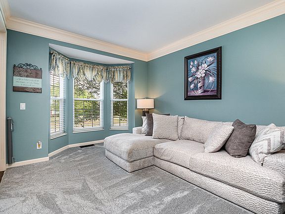 Wonderfully appointed former Drees/Zaring model home in stunning Hearthstone. Enjoy the pool, playground and pickle ball courts. Breath taking two story great room with newly re-finished gleaming hardwood. Updated cabinets. Stainless appliances. First floor study with built in shelving, living room and dining room make this the perfect home to entertain. The upper level has a huge primary bedroom with attached ensuite featuring large soaking tub and separate shower with double vanity. Home features THREE full baths with an additional first floor half bath for guests. Full finished basement with storage. Huge theatre room. Enormous rear deck, just sealed, could host 15 guests easily. Beautifully updated executive style home with a side entry garage. Short walk to all that Hearthstone has to offer.