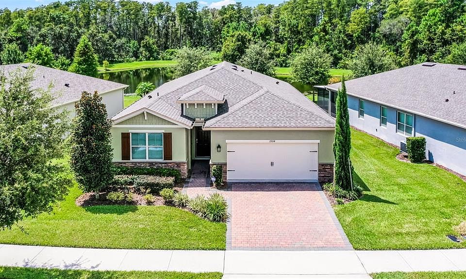 Water & Conservation Views – Premier Lot! Welcome home to the largest floor plan in The Palms at Serenoa, Clermont’s premier 55+ gated community offering resort-style living just 25 minutes from Walt Disney World. This stunning four-bedroom, two-bathroom single-story home offers 2,034 square feet of open living space on a premier waterfront lot with tranquil conservation views. The stone elevation, paved driveway, and fresh exterior paint completed in 2025 create beautiful curb appeal. Inside, extended wood-look tile floors, eight-foot doors, and abundant natural light flow through an open-concept design that seamlessly connects the great room, dining area, and gourmet kitchen. The kitchen is a showstopper with a large quartz island, stainless steel appliances, upgraded 42-inch soft-close cabinets with crown molding, a beautiful backsplash, and a custom walk-in pantry. The spacious dining area features a picturesque window overlooking the water and opens into the inviting living room. From there, sliding doors lead to the screened and covered lanai with brick pavers—the perfect spot for morning coffee or evening relaxation while enjoying serene water and nature views. The private primary suite is tucked at the rear of the home with peaceful water views and two walk-in closets. Its beautifully appointed bathroom includes a large walk-in shower, dual sinks, an expansive vanity, and a private water closet. Three additional bedrooms and a second full bathroom provide flexible space for guests, hobbies, or a home office, while the laundry room with a utility sink adds convenience. Thoughtful upgrades elevate this home, including a new roof and gutters installed in 2023, a whole-house water filtration and softener system added in 2025, and fresh exterior paint. With no waiting for construction and a premier lot location, this home is move-in ready. Life at The Palms at Serenoa is centered around an active lifestyle. Residents enjoy a heated resort-style pool with lap lanes, a state-of-the-art fitness and yoga studio, pickleball and bocce courts, a clubhouse with activity rooms, and a full-time lifestyle director who plans daily events and social gatherings. Scenic walking and biking trails, dog parks, and the convenience of included lawn care and internet make life here truly effortless. With just 570 homes, the community provides an intimate neighborhood feel while keeping you close to everything Clermont has to offer. The upcoming Sawgrass Boulevard extension will provide direct access to Winter Garden, Horizon West, and Disney, while Historic Downtown Clermont offers charming restaurants, boutique shopping, a weekly farmers market, and beautiful waterfront parks. You’ll also be just minutes from the upcoming Olympus in Clermont, a fully integrated destination offering an array of health, wellness, sports, and entertainment facilities that will bring exciting new amenities and experiences to the area. This home combines a premier lot, modern upgrades, and a vibrant 55+ lifestyle in a gated community that truly has it all. Schedule your showing today! Be sure to check out the video tour: http://bit.ly/4mzJXq3