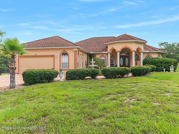 Price Reduction. Back on the Market due to buyer financing. A beautiful custom-designed Lexington pool home located on 1.03 acres zoned AR1 in the heart of Unit 10 of The Highlands. This spacious home has 3 bedrooms, 3 baths, bonus room or office, an attached 2.5 oversized garage and a detached 25' x 30' garage with fan and electric service. There are tray ceilings throughout, a formal living room and formal dining room. The kitchen has ivory colored cabinets, granite counters, stainless steel appliances including a double oven, cooktop stove and a large pantry. A breakfast bar overlooks the breakfast nook and a large family room with built-in shelves and faux fireplace. The master bedroom has 2 walk-in closets, a new ceiling fan and the master bath has two separate vanities, a walk-through shower and large soaking tub. A pool bath adjoins the master bedroom from the lanai. The split plan features two guest bedrooms, a guest bath, office, laundry room and linen closet. The pool has a spillover spa, lanai with pavers, and separate patio. Two driveways lead into the fenced backyard (vinyl and black chain link) and two pigeon lofts (12' x 40' and 10' x 24') are included in this sale. There are two HVAC units to accommodate the size of the house, a Kinetico osmosis system and a separate water softener. The community has no HOA so bring the boat or RV and since it is in pigeon country, you can bring the birds. Just minutes from the largest pigeon flying club in the country, the Gulfcoast Homing Club. Hospitals, shopping and quick access to the Suncoast Parkway make this a perfect place to call home.