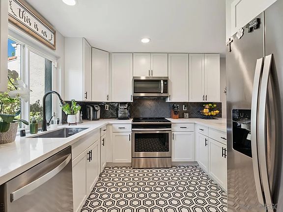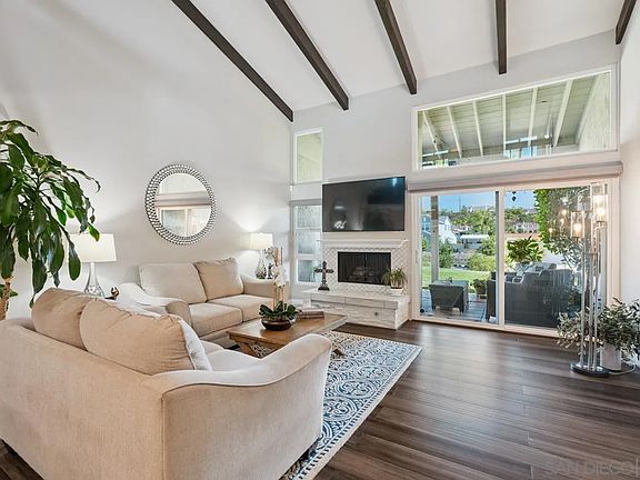 Welcome to this beautifully renovated 2-bedroom, 2-bath condo with a versatile loft-style den, ideally located in the heart of Poway. Remodeled in early 2020, this home offers modern design and thoughtful upgrades throughout. Soaring vaulted ceilings, exposed beams, and rich bamboo flooring anchor the open-concept living and dining areas, which feature updated ceiling fixtures and abundant natural light.. The designer kitchen showcases crisp white cabinetry, black hardware, quartz countertops, stainless steel appliances, and bold geometric tile flooring. Both bedrooms include updated flooring, while the primary suite features a stunning bath with a walk-in shower, glass enclosure, and modern finishes. The upstairs loft provides flexible space for a home office, lounge, or guest area. Step outside to a private covered patio overlooking a lush greenbelt—ideal for relaxing or entertaining. Additional highlights include in-unit laundry, ample storage, and easy access to walking trails, dining, and award-winning Poway schools.