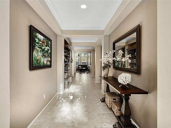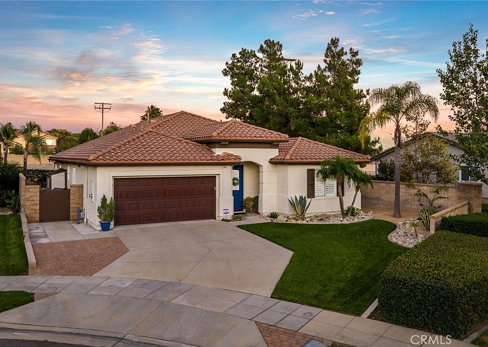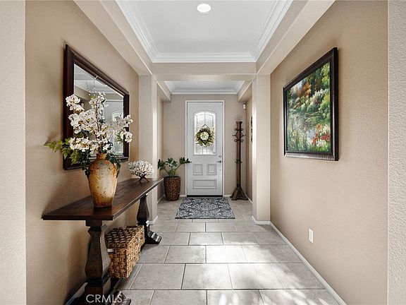 Completely Remodeled Single-Story in The Colonies | Private Cul-de-Sac Location with Mountain Views. Located at the end of a quiet cul-de-sac in the highly sought-after Colonies community, this beautifully remodeled single-story home offers privacy, panoramic mountain views, and elevated finishes throughout. With no rear neighbors, manicured landscaping, and a thoughtfully designed floor plan, this property delivers both comfort and sophistication. The front yard features a lush lawn, mature hedges, illuminated planters, and a covered front porch. Inside, tiled flooring leads you through a welcoming hallway accented by architectural niches, recessed lighting, and crown molding that extends throughout the home. The formal living and dining rooms showcase vaulted ceilings, a wall of windows with plantation shutters, hand-scraped hardwood flooring. The adjacent family room offers hardwood floors, a built-in bar, a custom media wall with tile backsplash, high ceilings, and expansive windows framing mountain views. The remodeled kitchen features custom cabinetry, granite countertops with full granite backsplash, stainless steel KitchenAid appliances, an island with bar seating, a pantry, and a sliding door to the backyard patio. A hallway powder room offers added convenience for guests. The primary suite includes vaulted ceilings, peaceful backyard views, dual walk-in closets with built-in organizers, and a luxurious en-suite bathroom with dual sinks, a frameless glass shower, and a separate soaking tub. Two additional bedrooms complete the layout, one currently set up as a home office, plus a remodeled hall bathroom featuring dual sinks and a tiled tub/shower with sliding glass enclosure. The indoor laundry room offers custom cabinetry and leads to the fully finished two-car garage, which boasts epoxy floors, built-in custom cabinetry with a workbench, an insulated garage door, and a smart opener. The low-maintenance backyard is perfect for relaxation and entertaining, featuring a lawn with concrete mow curbs, rock planters with accent lighting, a tranquil water fountain, queen palms, diamond-cut concrete decking, and two concrete side yards with storage sheds. Additional upgrades include a smart thermostat and an alarm system.