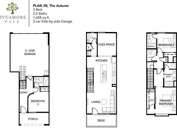 On the first floor of our "Autumn" floor plan as you enter through the private patio and covered porch, you'll find a full bedroom with full bath and your two-car side by side garage. The second floor is your main living level and features a spacious kitchen with large eat-in island, an open living room, a flex space that can make for a formal dining area or home office, and a large outdoor deck. On the upper level you'll find a conveniently located side by side laundry room, your large primary suite with walk-in closet and a secondary bedroom with private en-suite bath.
