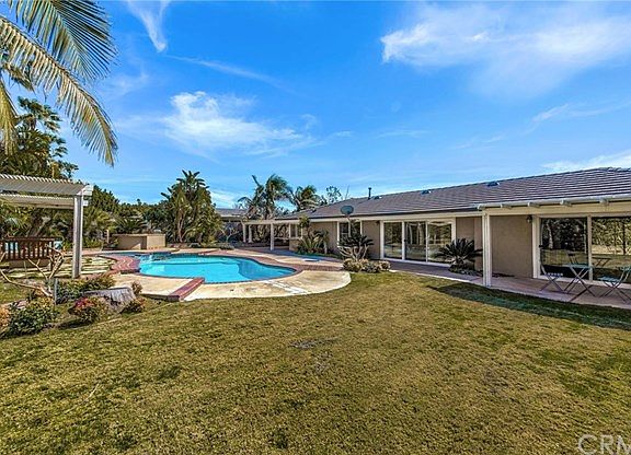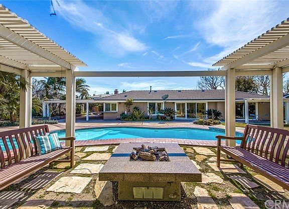 Stunning and private 4 Bedroom single level pool home with loads of upgrades. This beautifully updated home on a massive 13,500 square foot lot offers the ultimate outdoor entertaining experience with captivating pool, spa, seating area with a fire pit, built-in BBQ island, grassy play area and a large covered side patio. The refreshed exterior leads to a courtyard entry with a brick patio, great for lounging. Walk through your front double doors to your spacious living room w/views of the fabulous outdoor oasis & courtyards. The gourmet kitchen opens to the family room with a travertine tiled fireplace, wine-bar and sliding glass doors that lead to your large covered patio. The updated Kitchen features a center island, Wolf oven/range breakfast bar, granite counters & lots of cabinets. Bathrooms include travertine flooring/showers, dual sinks and granite countertops. The spacious master suite features Sliding Glass Doors that open to a covered patio & backyard. Other features include lots of hallway cabinets, 3 car attached garage with built-in storage. All this and more, located on a cul-de-sac street.