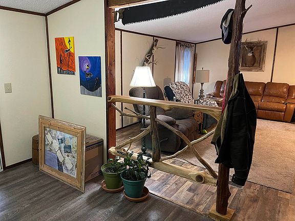 Well-kept mobile home w/ loads of custom upgrades. Very spacious living area w/ vaulted ceiling. Interior doors are hand made. Primary BR has barn doors, a custom bath w/ clawfoot tub & walk- in shower as well as large walk-in closet. Hall bath also has custom touches. Roomy kitchen w/ custom countertops & cabinets. New laminate flooring throughout. Beautiful covered screened-in porch on front of house. Also a large storage bldg. in back. You really must see it! Property is being sold as-is.
